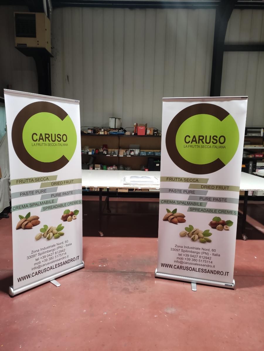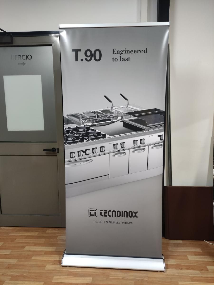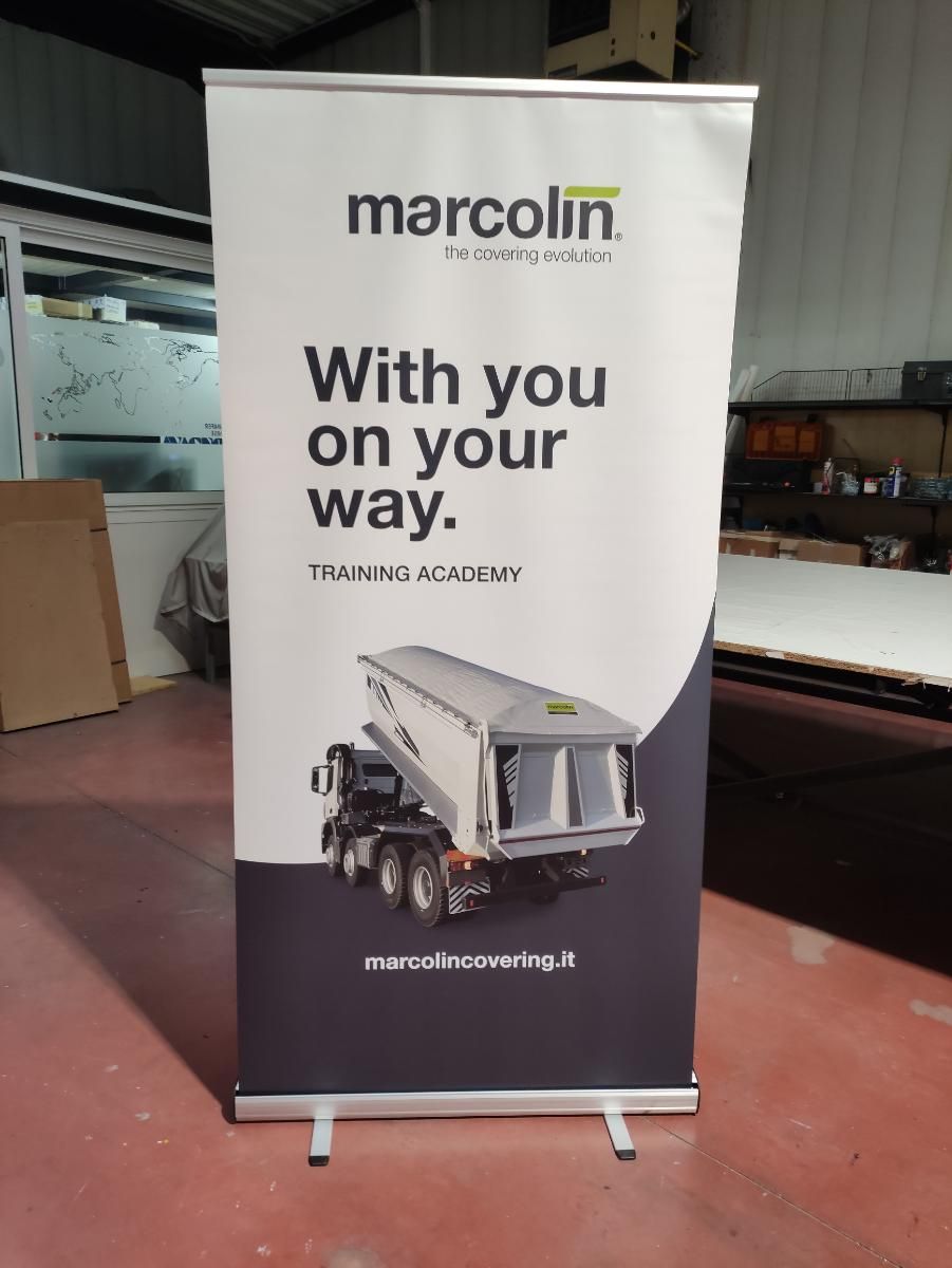 - Espositori roll-up: versioni slim e XL per dare visibilità a loghi, messaggi promozionali e lanci prodotto.